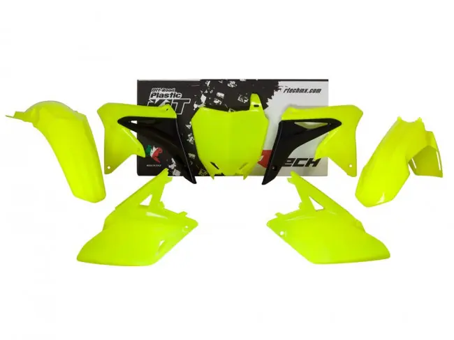 Racetech Plastik Kit in Neongelb, passend bei Suzuki RMZ 450 2008-2017, bestehend aus Kotflügel vorn & hinten, Kühler-Spoiler, Seitenteile und Nummertafel.