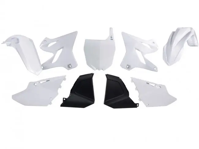 2015er Plastik Kit in Weiß, passend bei Yamaha YZ 125, 250 2006-2014, bestehend aus Kotflügel vorn & hinten, Kühler-Spoiler, Seitenteile und Startnummerntafel.