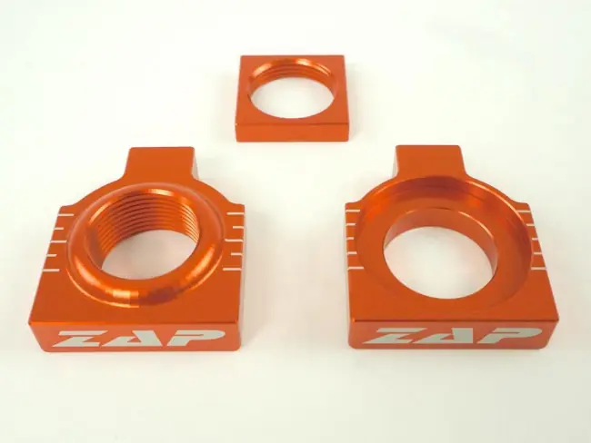 Orange eloxierte Achsenblöcke aus Aluminium für KTM SX und SXF Modelle ab Baujahr 2013-