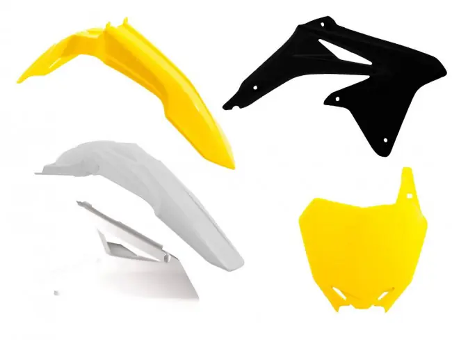 Racetech Plastik Kit in Schwarz Gelb US 2015, passend bei Suzuki RMZ 250 2010-2018, bestehend aus Kotflügel vorn & hinten, Kühler-Spoiler, Seitenteile und Nummertafel.