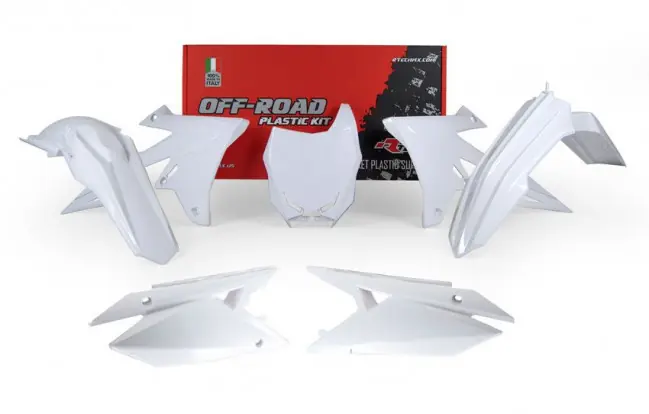 Racetech Plastik Kit in Weiß, passend bei Suzuki RMZ 450 ab 2018- und 250 ab 2019-, bestehend aus Kotflügel vorn & hinten, Kühler-Spoiler, Seitenteile und Nummertafel.