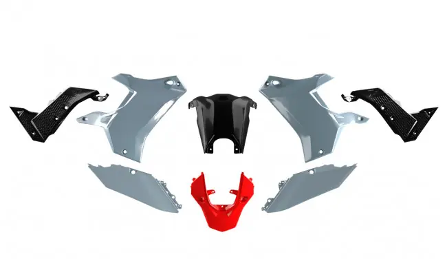 Es besteht aus zwei Kühlerverkleidungen, einer Tankabdeckung, zwei mittleren Rahmenabdeckungen, zwei hinteren Nummerntafeln und einem hinteren Kotflügel. Mit den Originalschrauben ist es Plug-and-Play-fähig und einfach zu montieren!