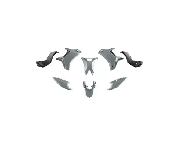 Enthalten sind zwei Kühlerverkleidungen, einer Tankabdeckung, zwei mittleren Rahmenabdeckungen, zwei hinteren Nummerntafeln und einem hinteren Kotflügel.