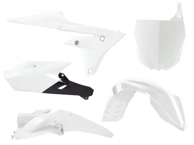 Plastik Kit in Weiß, passend bei Yamaha YZF 450 2014-2017 und YZF 250 2014-2018, bestehend aus Kotflügel vorn & hinten, Kühler-Spoiler, Startnummerntafel und Seitenteile.