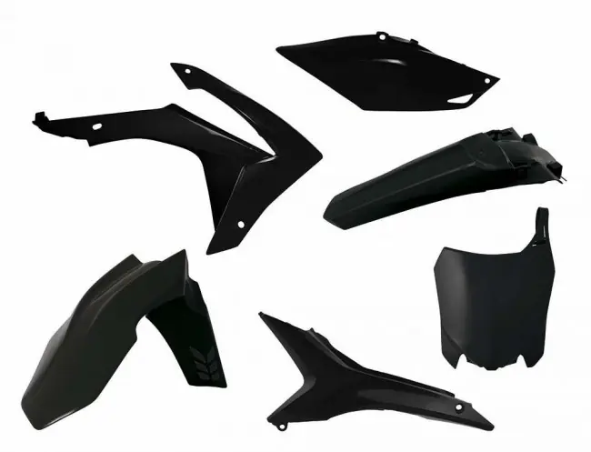 Racetech Plastik Kit in Schwarz, passend bei Honda CRF 250R 2014-2017 und CRF 450R 2013-2016, bestehend aus Kotflügel vorn & hinten, Kühler-Spoiler, Seitenteile und Nummertafel.
