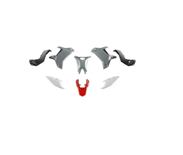 Enthalten sind zwei Kühlerverkleidungen, einer Tankabdeckung, zwei mittleren Rahmenabdeckungen, zwei hinteren Nummerntafeln und einem hinteren Kotflügel.